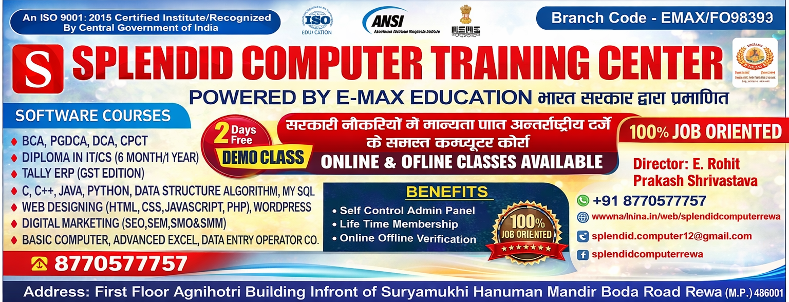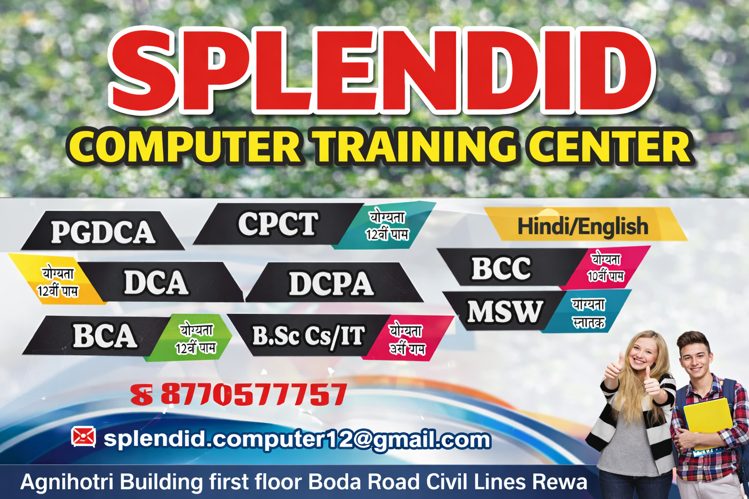Splendid Computer Training Center ek pratishthit aur vishwasniya computer education institute hai, jo vidyarthiyon, yuvaon aur working professionals ko quality computer education, practical skills aur job-oriented training pradan karne ke uddeshya se sthapit kiya gaya hai. Hamara institute Rewa (Madhya Pradesh) ke Civil Lines area me sthit hai aur pichhle...